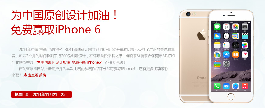 2014年中國?東莞“智谷杯”3D打印創意大賽自9月10日啟動開幕式以來就受到了廣泛的關注和喜愛,短短2個月的時間收到了近200份創意設計,在評審階段來臨之際,創客聯盟特聯合東莞市3D打印產業聯盟舉辦“為中國原創設計加油 免費抽取iPhone6”的抽獎活動!
