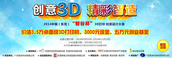 “創(chuàng)意3D·精彩智造”2014中國(東莞)“智谷杯”3D打印創(chuàng)意設(shè)計(jì)大賽是由東莞3D打印技術(shù)產(chǎn)業(yè)聯(lián)盟、南方報(bào)業(yè)傳媒主辦,以東莞市經(jīng)濟(jì)和信息化局、東莞市科學(xué)技術(shù)局為指導(dǎo)單位的設(shè)計(jì)比賽,自9月10日舉辦大賽的啟動(dòng)儀式、正式開始收集設(shè)計(jì)作品以來,截至今天(11月14日),大賽共收到59份3D打印創(chuàng)意設(shè)計(jì)作品,社會(huì)反響十分踴躍,引起全城“3D設(shè)計(jì)熱”。據(jù)悉,設(shè)計(jì)作品收集活動(dòng)截止時(shí)間為11月20日,廣大好“設(shè)”之徒還不趕快登錄: www.makerlm.com 加入我們的設(shè)計(jì)大軍?